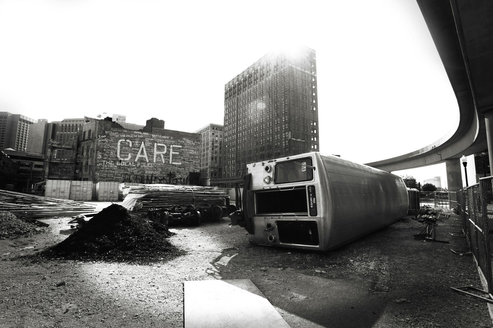 The above, is an interesting picture. But it speaks volumes. A derailment and the word, “CARE” on the building near it.